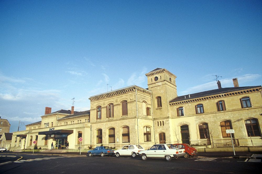 Façade de la gare des Aubrais (ou gare des Aubrais-Orléans) avec automobile pelliculée journal “La République”